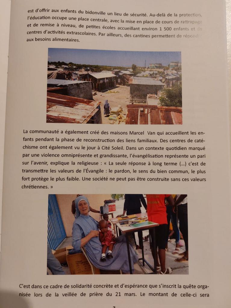 Entrée libre - Quête au profit d'Haïti. Au profit de ce pays martyr : HAÏTI. Là-bas, Soeur Paësie a choisi de vivre dans un des plus dangereux bidonville du monde :" Cité Soleil " - Port-au-Prince : La ville du kidnapping - Dans ce bidonville, Sr Paësie s'occupe d'enfants complètement laissés à l'abandon.